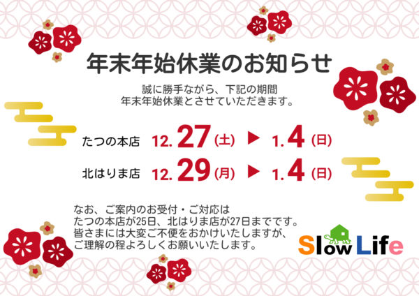 なお、ご案内のお受付・ご対応は、たつの本店が12月25日(木)まで、北はりま店が12月27日(土)までです。