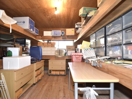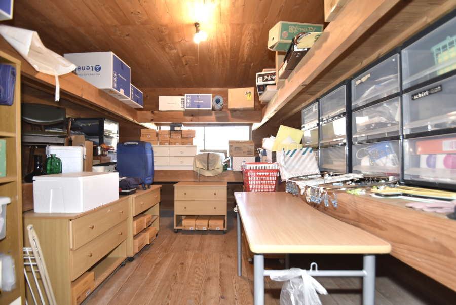 納戸は8畳です。棚が設けられており、天井まで空間を活かした収納が可能です。季節の道具や日用品など、かさばるものもすっきりと片付きますよ。