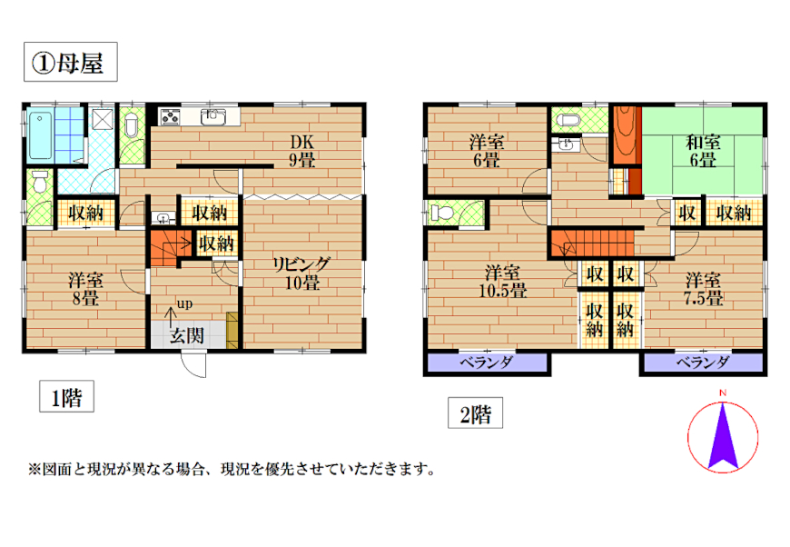 2階には個室が4部屋。洋室10.5畳・7.5畳・6畳、そして和室6畳があり、家族構成や用途に合わせて使いやすい間取りとなっています。2階にも、洋室10.5畳と、廊下にそれぞれお手洗いが備わっています♪