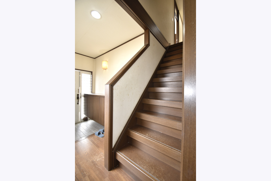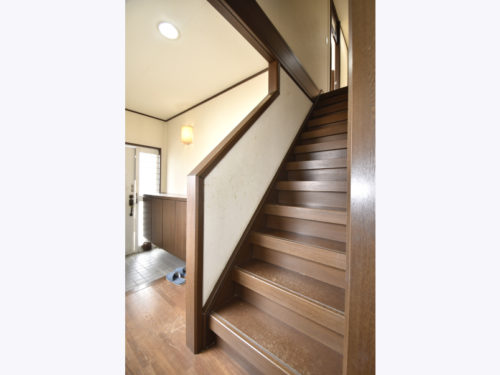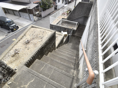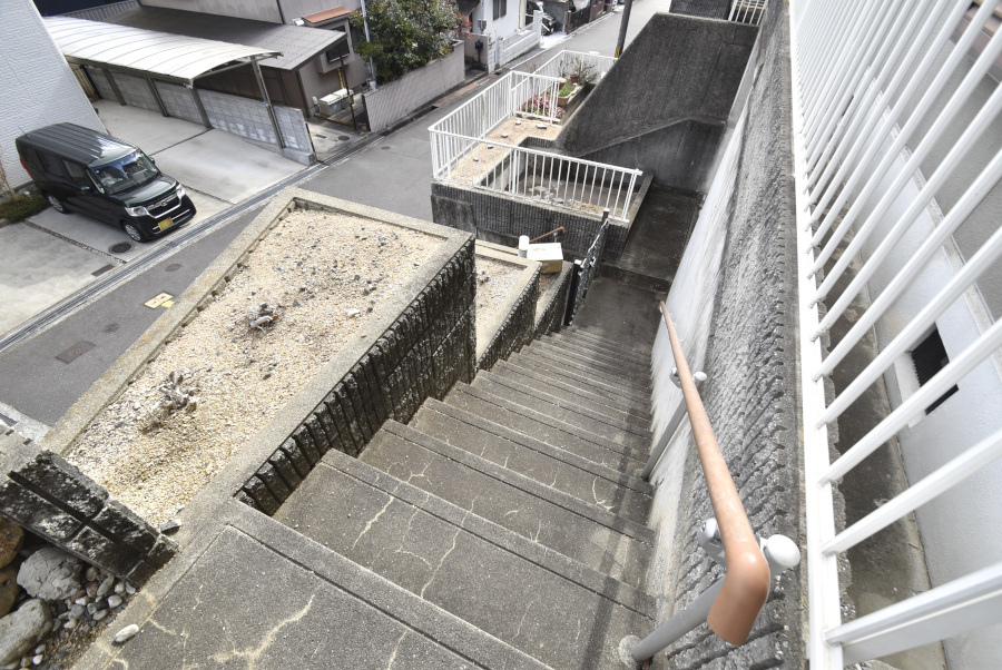 アプローチ階段には手すりが設置され、階段脇には花壇スペースもありますよ。