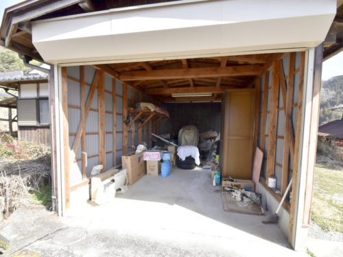 北側の建物側には車庫も備わっています。お庭と合わせて3台ほどの駐車が可能です。また、地続きの農地もあり、土いじりを通して自然と触れ合う暮らしを取り入れやすい環境です。