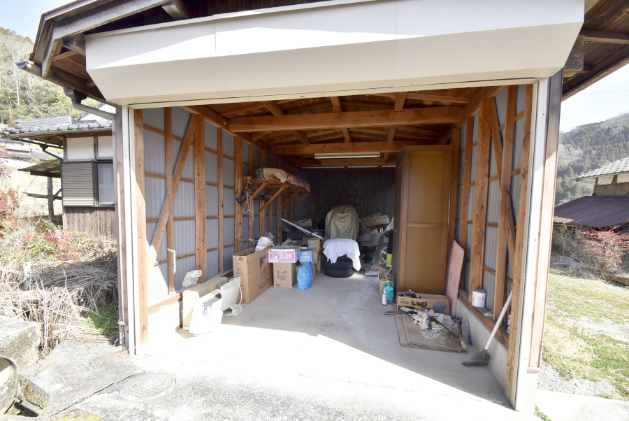 北側の建物側には車庫も備わっています。お庭と合わせて3台ほどの駐車が可能です。また、地続きの農地もあり、土いじりを通して自然と触れ合う暮らしを取り入れやすい環境です。