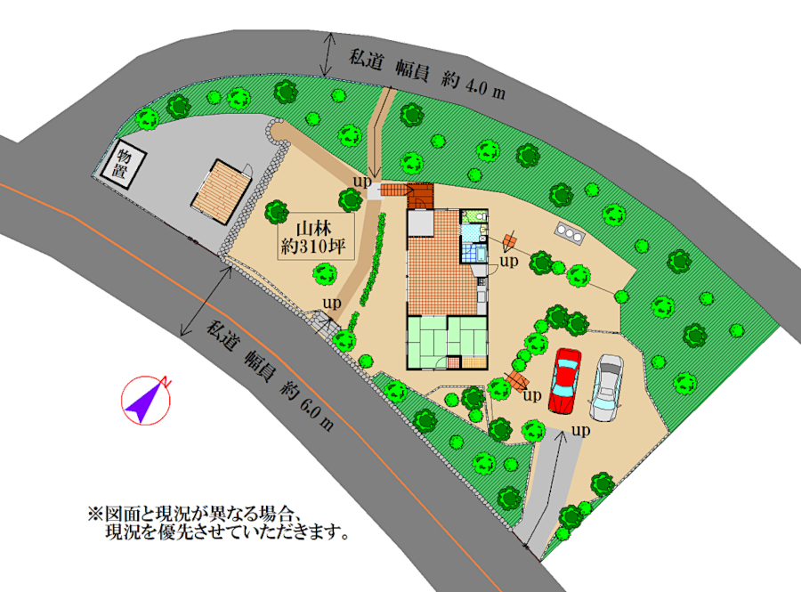土地は約310坪と広く、比較的傾斜や起伏の少ない地形です。敷地内東側には駐車スペースも確保されているため、複数台での利用や来客時にも安心です。