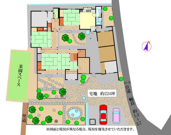 敷地内には家庭菜園や植栽を楽しめるスペースもあり、コンクリート敷きの駐車スペースも備わっています。