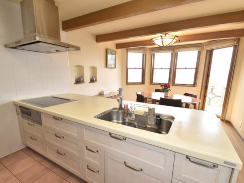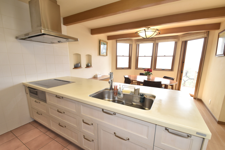 キッチンは開放的な対面式のペニンシュラ型で、1つで水・お湯・浄水が出るスマート蛇口を採用しています。