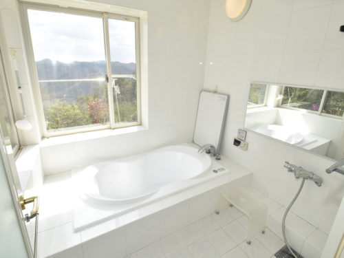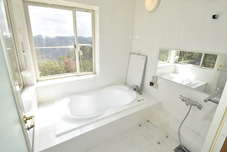 2方向の大きな窓がある浴室では、お庭と山の景色を眺めながら、露天風呂のような開放感を味わえます。